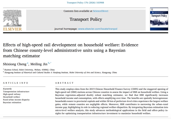 近日,我院程时雄教授及其团队在《Transport Policy》发表题为《Effects of High-Speed Rail Development on Household Welfare: Evidence from Chinese County-Level Administrative Units Using a Bayesian Matching Estimator》的研究论文。该论文由我院程时雄教授担任第一作者,其指导的博士生金美玲(现湖北文理学院老师)为论文通讯作者。