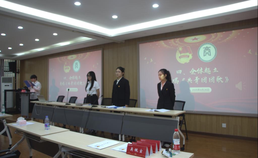 大会闭幕式环节,两届学生会主席团成员完成院旗交接仪式,新一届主席团成员庄严宣誓就职。最后,全体人员起立奏唱《共青团团歌》,湖北大学商学院第七次学生代表大会圆满落幕。