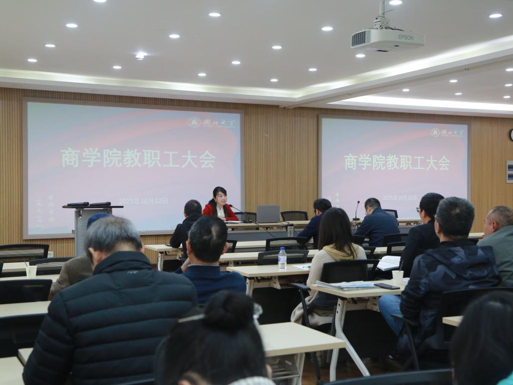 10月22日下午,商学院在逸夫楼C2014报告厅召开全院教职工大会,会议由党委书记何肖主持。