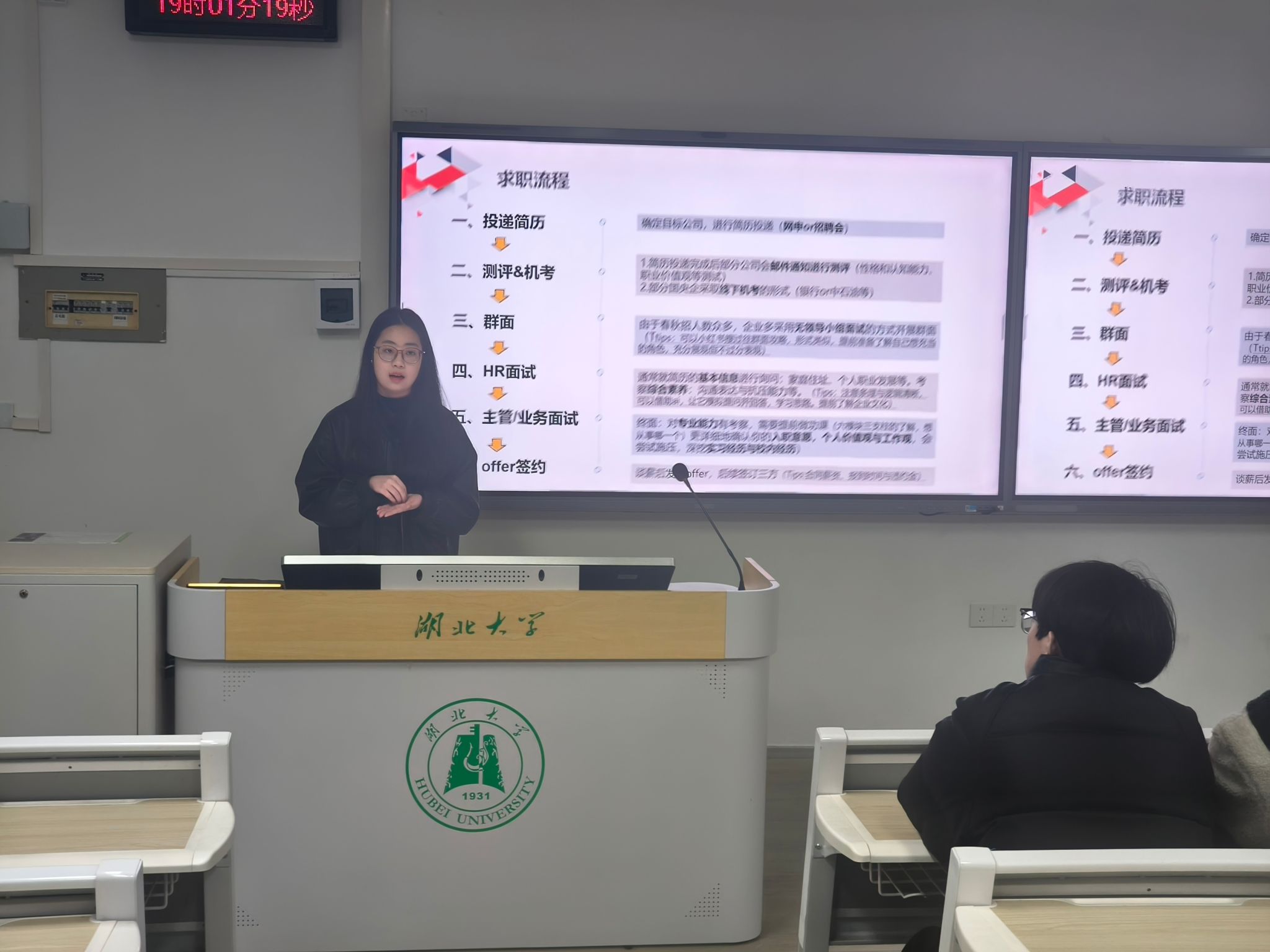 班主任胡艺怀围绕当前考研、考公、就业整体形势与政策要点进行系统解读,帮助同学们明晰发展路径、把握关键节点。班会还邀请了2022级学生陈希参加,她结合自身求职实战经历,从简历投递、笔试测评、群面、HR面试、业务面试、offer签约全流程分享经验干货,针对备考技巧、心态调适、细节把控等内容作实用指导,现场交流氛围热烈融洽。